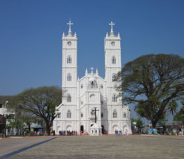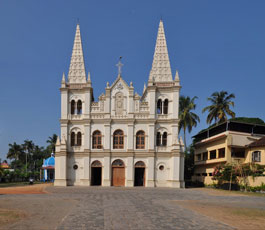 Near the St Francis church is the colossal Roman Catholic Basilica of Santa Cruz (Holy Cross). The Basilica built by the Portuguese, has an excellent gothic façade flanked by two majestic towers. The church was given the status of a Cathedral in 1558 by Pope Paul IV and subsequently the status of a Basilica in 1984 by Pope John Paul II. The present structure was built in 1905 with exquisite frescoes and murals by the famous Italian painter Br. Moschini S.J. There is a beautiful painting of the last supper on top of the main altar and 7 spectacularly done large canvas paintings on the passion of Christ on the ceiling. The artistic grandeur emanating from the Basilica is further aggrandized by its beautiful stained glass windows and intricate carvings on the walls.